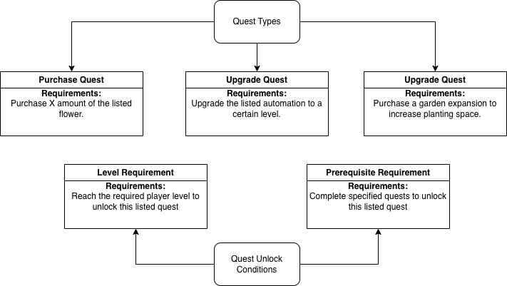 Quests were created to act as goals for players to work towards, while acting as a pseudo-guide to direct player towards their new unlocks. Quests were Quest went through multiple iterations through the entire development.